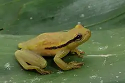 This frog lives in arboreal bromeliad plants high in the rainforest canopy. The female frog lays small clutches of eggs on the leaves of the bromeliad plants. When the eggs hatch, the tadpoles fall into the water that collects in the axil, where they swim and develop.[1]