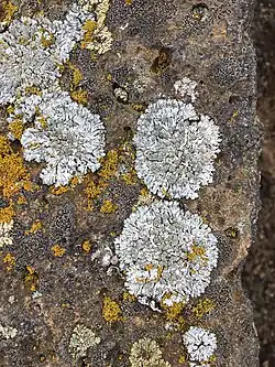 It is common on calcareous substrates, growing on limestone (including tufa) and concrete.[19] It also grows on basaltic and siliceous rock, as well as on bone.[3] It is particularly common on rocks where birds perch and defecate.[9] It is uncommon on bark;[9] however, in the Colorado Rocky Mountains, it is one of the predominant lichens on juniper trees, growing primarily within 0.1 m (3.9 in) of the ground on the northern and eastern side of trunks.[20] In Antarctica, it grows on mosses, soil and gravel, and may be among the species contributing to the formation of a soil crust on the continent.[18] In California, it is found in montane and subalpine forests ranging from 1,000–8,000 ft (300–2,440 m) in elevation.[10]