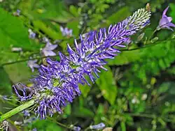 The light blue-violet flowers are fivefold. They are produced in dense erect panicles, about 4–10 cm (1.6–3.9 in) long. The inflorescence is ovate-cylindrical. The bracts are narrow - lanceolate. The flowering period extends from June to August. The fruit is a capsule containing numerous small seeds.