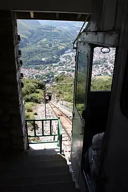 The mountain is accessible by funicular, which has been in operation since 1900. It transports passengers up to 950 m high, which follows a 1,100 m (3,600 ft) long route, on a slope varying from 27% (right at the beginning) to 56%.[1] The route separates in two in the middle to enable the two trains to pass. It travels through two tunnels and over a viaduct, which can be seen from distance, such as from the route linking Lourdes to Argelès (Argelès-Lourdes direction). The lower station is accessible near the route (indicated by arrows from the southern Lourdes exit roundabout). One can also get to it by bus from the town-centre.
