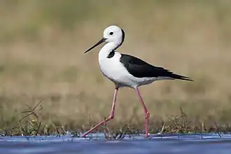 The pied stilt grows to a length of about 14 in (36 cm) with a wingspan of about 26.5 in (67 cm). The back of the head and neck, the back and the upper surfaces of the wings are glossy greenish-black. The undersides of the wings are plain black and the remainder of the plumage is white, apart from the tail feathers which are tinged with grey. The long, thin legs are pink and the toes have black claws. The long slender beak is black and the irises and the eyelids are red.[3]