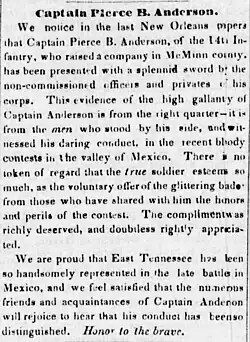 He served as a captain of infantry in the Mexican-American War from 1847 to 1848.[1] His son Andrew L. Anderson, later a medical doctor, served alongside him and fought in battles "between Mexico City and Vera Cruz."[10][11] Col. P. B. Anderson is remembered for his actions at the Battle of Chapultepec when "a Mexican shell fell in the centre of Capt. Anderson's company" which instantly killed 16 or 17 soldiers.[2] Anderson reportedly rallied his troops with the call, "Never mind, my brave men; remember, you are Tennesseans! Forward!" and was later presented with a commemorative sword engraved with those words.[2][6]