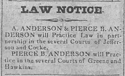 - ^ "Pierce B. Anderson, State bank, run for congress". The Knoxville Register. June 25, 1845. p. 2. Retrieved 2024-10-02.