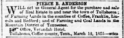 Along with his brother Dr. Thomas Von Albade Anderson, he was part of the founding Town Company of Tullahoma, Tennessee and "planned, surveyed & drew maps of original plot of Tullahoma & was instrumental in moving the Coffee/Franklin Co. line in order that all of the town would lie in Coffee Co."[13] The Tullahoma land venture was apparently unprofitable for the brothers,[12] due to what one history called "unfortunate business transactions and unscrupulous friends."[14] What was called the McRee House, constructed of brick and said to be the second-oldest building in Tullahoma, was built for Anderson in 1854 and stood until it was destroyed in a fire in 1901.[15]