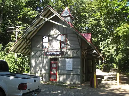 Piermont Railroad Station is a historic train station located at Piermont in Rockland County, New York. It was built about 1873 by the Northern Railroad of New Jersey, later acquired by the Erie Railroad. It is a 1+1⁄2-story, light frame building above a stone foundation. It features Stick Style exterior siding and a Late Victorian interior.[5]