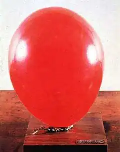 Contemporaneously with the Bodies of Air (Corpi D'Aria), Manzoni produced the Artist's Breaths (Fiato d'Artista), a series of red, white or blue balloons, inflated and attached to a wooden base inscribed "Piero Manzoni- Artist's Breath". The works continued Manzoni's obsession with the limits of physicality, whilst parodying the Art World's obsession with permanence, and also provided a poignant Memento Mori.