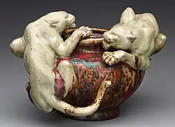 His shapes were often sculptural, either in their broad shape, or sometimes incorporating figures modelled by sculptors he collaborated with.[4] The Symbolist sculptor Alphonse Voisin-Delacroix (1857–1893) was one collaborator until his early death.[5] Like some other Art Nouveau potters Dalpayrat often made pieces to be mounted with metal elements by metalworking firms, including one lamp base designed with a glass and metal shade by Tiffany Studios of New York. This marriage was very likely arranged by Siegfried Bing, whose Paris gallery Maison de l'Art Nouveau sold works by both makers.[6] An inkwell with bronze mounts, also in the Metropolitan Museum of Art, has the metal marked by Edward Colonna, a regular designer in metal for Bing.[7]