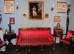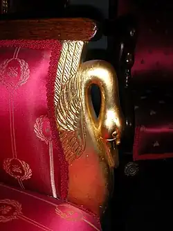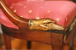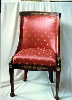 In 1817 President James Monroe purchased a suite of furniture for the White House, which was made famous in Jacqueline Kennedy's TV tour of the White House. The furniture is in the Blue Room.[1] He also produced furniture for Napoleon at Saint-Cloud, for the Tuileries, Joséphine's Château de Malmaison, and also for his brother Joseph Bonaparte. Examples of his work can be seen at Windsor Castle and Buckingham Palace in England. The set of furniture, property of the Yuko Nii Foundation, in the Treasure Room of the Williamsburg Art & Historical Center in Williamsburg, Brooklyn, is of the period when Napoleon was emperor, around 1810, and has the swan motif favored by Josephine, his first wife. It is entirely possible that this set was made for one of Napoleon's or Josephine's rooms.