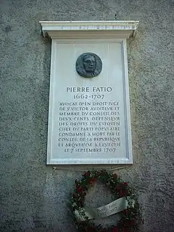 Among Fatio's bourgeois supporters was Jean-Jacques Rousseau's grandfather, David Rousseau, who thereby lost his government employment. Fatio has been described by some historians as the "Swiss Gracchus". A commemorative plaque declaring him a "defender of citizens' rights" now marks the entrance to the Rue Jean Calvin, in the historical center of Geneva.