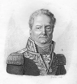 Margaron was transferred to the army in Germany[36] and promoted to general of division on 16 August 1813.[1] During the Battle of Leipzig on 16–19 October 1813 he commanded the 4,820-man garrison of Leipzig, consisting of two brigades supported by two French horse artillery batteries of 12 total guns and a 4-gun half-battery. Annet Morio de L'isle led the French brigade which included the 2nd Battalions of the 96th and 103rd Line Infantry, the 4th Battalion of the 132nd Line and a converged battalion of the 35th/36th Light Infantry. Count Hochberg directed the Grand Duchy of Baden brigade which was made up of one battalion of the 2nd Line Infantry and the Lingg Light Battalion.[37]