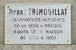 An 1899 reviewer said of his work that his modernist poems included elements derived from the 17th century work of Molière. He had a mischievous and caustic wit.[6] Starting in the early 1900s Trimouillat stopped performing apart from short appearances for charity. Trimouillat died in 1929.[1] He lived at 10, rue Chanoinesse from 1890 to 1929. His home is commemorated by a plaque.[7]