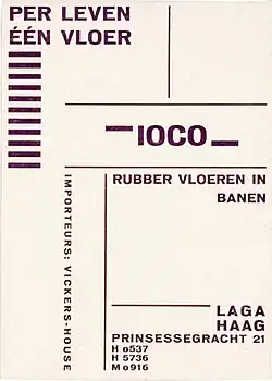 In 1920, he got an assignment from the flooring company Vickers House. He made several advertisements for this client. “Zagen, boren, vijlen” (saws, drills and files) Zwart solved a practical print problem by assembling letters, blanks, and symbols from print houses.[13]