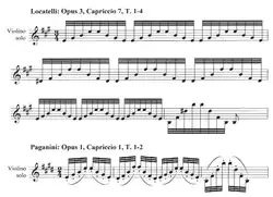 Examples of virtuoso works are the Violin Concertos Op. 3 with their associated Capricci, and the Violin Sonata Op. 6 with one Capriccio. Both works, and especially Op. 3, were standards for virtuosos and made him famous throughout Europe. The Capricci were important study and exercise pieces but were not intended for public performance.[28] It was probably through French violin schools that musicians such as Niccolò Paganini discovered Locatelli's music. Paganini's Capriccio Op. 1, Nr. 1 is similar to Locatelli's Capriccio Nr. 7.[29]