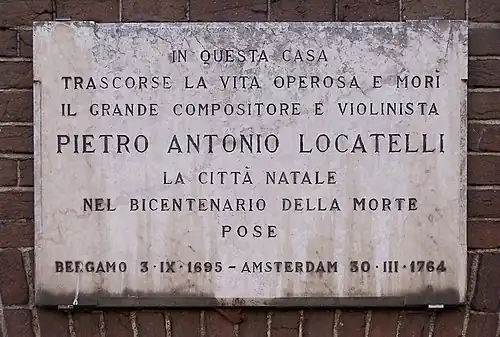 Locatelli died on 30 March 1764[22] in his house on the Prinsengracht.[23] He was buried in the English Reformed Church on the Begijnhof. In 2024 a small monument made by Fabio Pravisani was erected there in his honour.[24]