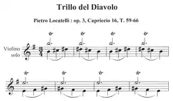 Locatelli's virtuosity is reflected in the Capricci through the use of high registers, double stopping, chords and arpeggios with wide fingering and overextension of the left hand, harmonics, trills in two-part passages (Trillo del Diavolo), double trills, varied bow types and variable bowings.[30]