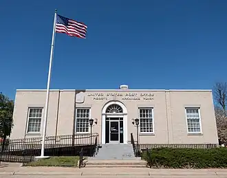The Piggott Post Office is located at 119 North 3rd Street in central Piggott, Arkansas. It is a single-story brick building, with a flat roof that has an encircling parapet, and a concrete foundation. Construction on the building took place mostly in 1937, but was not completed until 1941. The building is noted for its lobby murals, painted by Iowa native Dan Rhodes, with funding from the United States Treasury Department's Section of Fine Arts, a Depression-era jobs program for artists. The murals depict air mail postal service.[2]