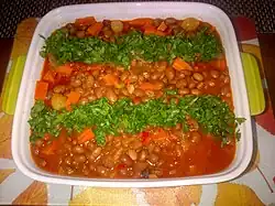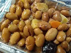 Pilaki is a style of meze and may refer to several dishes that are cooked in a sauce made out of onion, garlic, carrot, potato, tomato or tomato paste, sugar, and olive oil. Beans used in this style are white beans,[1][2] or borlotti beans. They are served cold, garnished with parsley and slices of lemon. Fish pilaki is also a popular recipe. In Turkey cuisine, this style is known as plaki.[3][4][5] In Bulgarian cuisine the name is "plakiya".