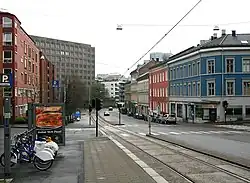 Pilestredet at Høyskolesenteret tram station in front of Oslo Metropolitan University