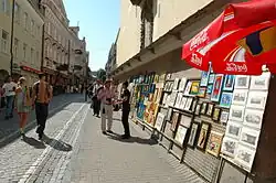 Pilies Street is a popular location for market traders to sell the wares of folk artists. It has a natural advantage over the Town Hall Square as the street is generally busy and less likely to be interrupted by the political or cultural events commonly held at the Town Hall. Souvenir shops offer amberware and amber jewelry as well as linen clothes. The street is also known for the Kaziukas Fair, when folk artists from all over Lithuania gather here to display and sell their latest merchandise.