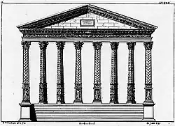 However, Louis-Auguste Bosseboeuf and Octave de Rochebrune do not mention the hypothesis of a pillar and attribute all the sculpted blocks to the temple.[26][9] Émile Espérandieu correctly identifies a pillar, but in 1912, in the Revue archéologique and on a suggestion by Franz Cumont,[27] proposes a reconstruction that is not considered very credible by Henry Auvray in the 1930s.[25] This hypothesis is distinct from that proposed by Jean-Pierre Adam.[28] Adam's reconstruction, proposed in 1972, is more aligned with the available evidence and suggests that the column, estimated to be nine meters high, consists of a bare base, three tiers of sculpted blocks with successive setbacks, and is topped by a now-missing monumental statue.[21] This interpretation concludes that the pillar takes the form of a very elongated step pyramid.[T 5] The stylistic differences between the various levels of decoration indicate that multiple sculpting workshops were simultaneously producing the pillar's different tiers.[29]