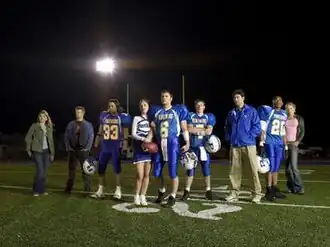 Berg expressed regret in interviews about having to sacrifice certain story lines in the movie, due to time restraints. The television series allowed interpersonal issues to be addressed more in depth.[3] "The idea was to create a television show that exists as much more of a soap opera, or an exploration of human beings," said Berg in an interview, "than as a chronicle of a football team's pursuit of glory."[4] The series was filmed partly in Austin, and a call went out for local football players to play part roles in the show.[5] In an attempt to maintain an authentic Texas environment, elements were incorporated from local society. Football scenes were filmed at the local Pflugerville High School's Kuempel Stadium and at the RRISD Complex, while uniforms were based on those of real-life Pflugerville Panthers.[6]