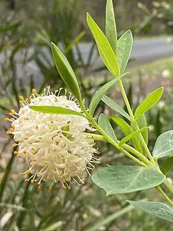 - Pimelea ligustrina subsp. ciliata Threlfall[7] is a shrub up to 1.5 m (4 ft 11 in) high with elliptic leaves mostly 15–40 mm (0.59–1.57 in) long, and heads of 20 to 70 flowers on a glabrous peduncle, mainly from February to March.[8][9][10]