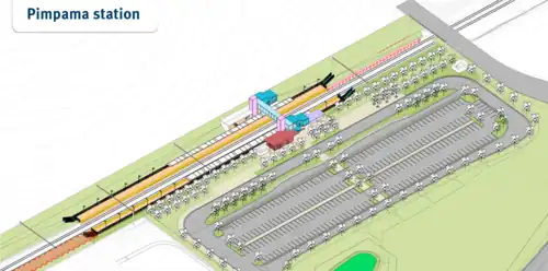 The location for Pimpama station is off the Old Pacific Highway, near the Pimpama City Shopping Centre. The station will be integrated with other modes of public transport, and is planned to feature connections with pedestrian and bicycle paths. Each platform has a lift.[4] The station concept design includes space for 380 car park bays.[4] Pimpama station will offer a 40-bicycle lock up enclosure.[4]