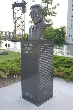 Following his sudden death in 1995 due to pancreatic cancer, Tom's wish that a park be built for Chinatown residents came true on October 2, 1999, when the Chicago Park District dedicated the 12-acre (49,000 m2) Ping Tom Memorial Park next to the Chinatown Square in his name. In 2005, a bust of Tom was installed in the park to commemorate the 10th anniversary of his death.