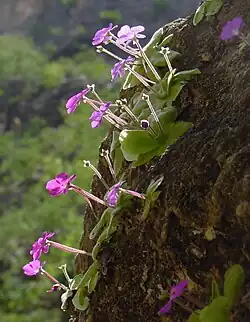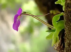 Pinguicula elizabethiae is a perennial rosette-forming insectivorous herb native to the Mexican states of Querétaro and Hidalgo.[1] A species of butterwort, it forms summer rosettes of flat, succulent leaves up to 5 centimetres (2.0 in) long, which are covered in mucilaginous (sticky) glands that attract, trap, and digest arthropod prey. Nutrients derived from the prey are used to supplement the nutrient-poor substrate that the plant grows in. In the winter the plant forms a non-carnivorous rosette of small, fleshy leaves that conserves energy while food and moisture supplies are low. Single purple flowers appear between July and October on upright stalks up to 75 millimeters long.
