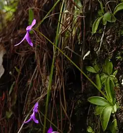 Pinguicula orchidioides /pɪŋˈɡwɪkjʊlə ɔːrkɪdiˈɔɪdiːz/ is a perennial rosette-forming insectivorous herb native to Mexico and Guatemala.[1] A species of butterwort, it forms summer rosettes of flat, succulent leaves up to 5 centimeters (2 in) long, which are covered in mucilaginous (sticky) glands that attract, trap, and digest arthropod prey. Nutrients derived from the prey are used to supplement the nutrient-poor substrate that the plant grows in. Uniquely among Pinguicula species from the Americas, p. orchidioides produces gemma-like basal buds which elongate into stolons and serve as a means of asexual reproduction. In the winter the plant forms a non-carnivorous rosette of small, fleshy leaves that conserves energy while food and moisture supplies are low. Single purple flowers appear between July and September on upright stalks up to 22 centimeters long.