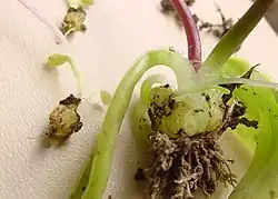 In a feature unique among Mexican Pinguicula,[3] P. orchidioides produces stolons throughout the summer growing period. These start out as gemma-like buds in the winter rosette and elongate into whip-like stolons up to 8 centimeters (3 in) long during the summer.[4] These stolons, which have small non-glandular leaves interspersed along their length, can take root to form new plantlets upon contact with a suitable growing substrate. This trait allows the species to form clumps of plants, many of which are genetically identical.