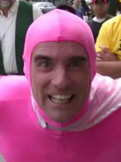 Pink Man has performed in Oregon, Los Angeles, Houston, the San Francisco Bay Area, New Jersey, New York, the Pacific Northwest, Jacksonville, Vancouver, Paris, Tokyo, and Germany.[1][2][3] His Tokyo and Paris trips were sponsored by computer-game designer Will Wright, who calls Pink Man "the only real superhero I know".[1]
