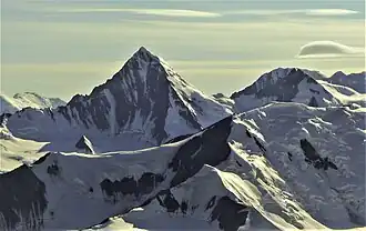 Pinnacle Peak is a remote 3,714-meter-elevation (12,185-foot) mountain summit of the Saint Elias Mountains, in Kluane National Park of Yukon, Canada. It ranks as the 37th-highest officially named mountain in Canada.[5] It is situated at the head of the South Arm of the Kaskawulsh Glacier. Topographic relief is significant as the summit rises 1,500 meters (4,900 feet) above the Dusty Glacier in 3.5 kilometers (2.2 miles). Neighbors include Mount Kennedy, 14 km to the south, and Mount Alverstone, 14 km to the south-southwest.