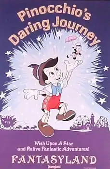 Pinocchio's Daring Journey is a dark ride at Tokyo Disneyland, Disneyland, and Disneyland Park (Paris). Located in the Fantasyland section of each park, this ride is based on Disney's 1940 animated film version of the classic story, which was the studio's second animated feature film.[1] The attraction tells an abbreviated version of the film, with Pinocchio escaping from Stromboli's puppet show and visiting Pleasure Island, ignoring Jiminy Cricket's advice. Monstro the whale makes an appearance, and Pinocchio is finally reunited with Geppetto and turned into a real boy.