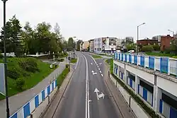 The main transportation artery in Piotrowice is national road 81, along which Tadeusz Kościuszko Street runs through the district. This road serves as an exit southward towards Mikołów, Żory, and Skoczów. It also provides a direct connection between Piotrowice and Śródmieście.[77] This road intersects with Armii Krajowej Street, which runs north–south. Armii Krajowej Street is a county road classified as a collector road (Z)[78] and connects Piotrowice from the north with Ligota through Zadole, and to the south with Kostuchna and Podlesie. In the center of Piotrowice, Armii Krajowej Street intersects with another important road in the district: Zygmunt Walter-Janke Street. It connects the western part of Piotrowice – Kąty Piotrowickie with Ochojec and further with Brynów. This street is also a county road of class Z.[78] Other important roads in Piotrowice include Aleksander Kostka-Napierski Street, Father Stanisław Wilczewski Street, and Wojska Polskiego Street.
