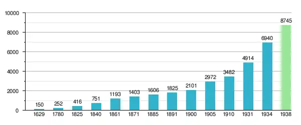 Data sources: 1629;[61] 1780;[61] 1825;[62] 1840[61] (according to another source,[29] the same number of residents was recorded in 1830); 1861;[61] 1871;[62] 1885;[63] 1891;[62] 1900[62] (according to another source,[29] there were 2,053 residents in 1900); 1905[63] (according to another source,[61] there were 2,931 people in the municipality at that time); 1910[63] (according to another source,[61] Piotrowice had 3,500 residents at that time); 1931;[61] 1934;[62] 1938[61].