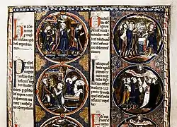The circumstances of Pepin's birth remain unclear to modern scholars, especially regarding the legitimacy of his mother's union to Charles. Most Carolingian-era sources dismiss Charles' first union as illegitimate. The contemporary historian Einhard writes merely that Pepin was born to a "concubine", and he does not list him among Charlemagne's legitimate offspring.[1] Although it is possible that Pepin was born to a now-forgotten concubine, Einhard is probably referring to Himiltrude—the first child-bearing partner of Charlemagne, about whom little is now known.[2] However, Einhard and most other Carolingian historians worked in the courts of Charlemagne's successors, and had a vested interest in undermining the legitimacy of the claims of other potential royal lines. These writers may have maligned Charles' union to Himiltrude after the fact, in order to lend a post facto justification to Pepin's later disinheritance.