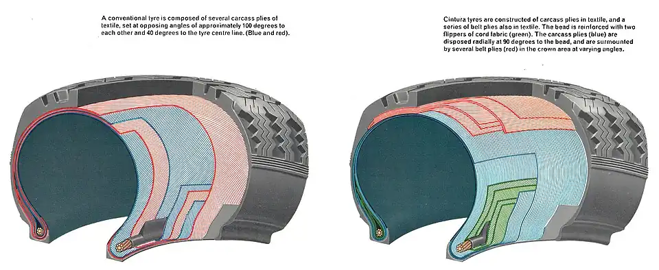 First developed in 1952 under the name Pirelli Cintura, taking the name Cinturato in 1963, the tyre was composed of two or three carcass plies of cords laid at an angle of 90 degrees to the beads, and a belt of several plies laid circumferentially under the tread. Without a belt, the 90-degree plies would produce a casing which would greatly increase its sectional height on inflation. The belt, being inextensible, prevented the casing increasing in height when inflated, and the inflated tyre maintained almost the same dimensions as in the mould in which it went through vulcanisation. The belt was kept under tension, and the tread retained its flatter profile even when the tyre was inflated.[2]