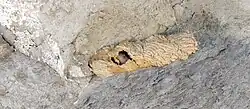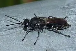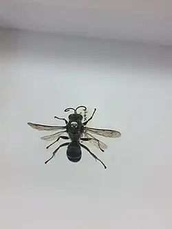 Like all insects, P. spinolae has a hard exoskeleton, one pair of antennae and three pairs of legs. These legs are strong as they need to be able to carry spiders back to their nests for their young.[1] It has a segmented body divided into three sections; head, thorax and abdomen and two pairs of wings. An easily identifiable feature of the mason wasp, similar to other wasp species is the thin waist between the thorax and abdomen. This helps to tell the difference between a wasp and bee. The mason wasp is able to use its stinger repeatedly unlike bees.[2] It relies on this to inject venom into spiders which paralyses them and allows the adult female to carry the spider back to the nest. Unlike some commonly-known wasps, P. spinolae is not black and yellow, the adult's body is fully black and has a length of approximately 16 millimetres (0.63 in).[3] The nest of the mason wasp is constructed from predominantly sand and mud. It is small in size and widely abundant, found in places such as cracks of buildings and keyholes. The most obvious characteristic used for identification is the multiple single compartments sealed off from each other. Each contains a paralysed spider and an offspring of the adult female.[4] Understanding the features of the mason wasp nest make the Juvenile stages easier to identify. The egg of the mason wasp is a white elongated oval shape. Later this develops into larvae which are white with a distinctive head and a translucent cuticle. The larvae then form a cocoon which is cylindrical, grey and rounded at either end.[5]