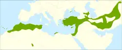 It is native to a section of Eurasia from North Africa to the Iranian Plateau, where it was once common.[6] Because other trees were rare, it was the only good source of wood and was overharvested, reducing its current distribution.[6] It is a common tree in mountain forests in Iran,[6] and it is "characteristic" of the landscape in parts of Algeria outside the Sahara.[10]