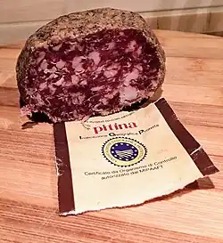 Pitina, peta or petuccia is an Italian salume originating in the Dolomite valleys of Tramonti di Sopra and Tramonti di Sotto, and the River Cellina, in the northeastern province of Pordenone, Friuli-Venezia Giulia. It is not a true sausage, but a meatball made of smoked meats. The recipe was probably based on the impromptu need to preserve game. The preparation method did not require specialized equipment making it available to all homes, even the most isolated mountain huts.