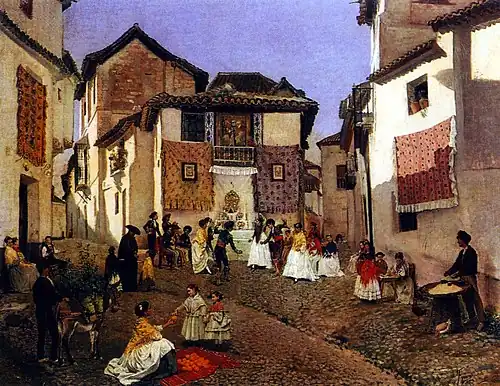 In 1870, he relocated to Madrid, where he became one of the founders of the Círculo de Bellas Artes and the "Asociación de Acuarelistas de Madrid". He also became a Professor at the Real Academia de Bellas Artes de San Fernando and began showing his works at the annual National Exhibition of Fine Arts, where he won medals in 1871, 1890 and 1892.[1] His illustrations often appeared in the magazine Blanco y Negro. In 1882, he was awarded the Cross of the Order of Carlos III.[2]