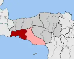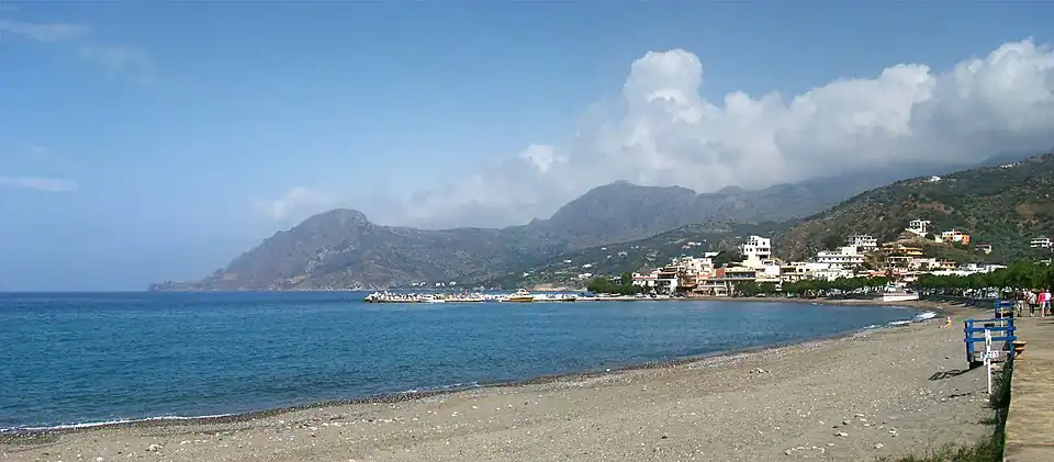 Plakias (Greek: Πλακιάς) is a village on the south coast of the Greek island of Crete, in the Rethymno regional unit, about 21 kilometres south of the city of Rethymno. It is part of the municipality Agios Vasileios, and of the municipal unit Foinikas. It is surrounded by mountains to the north and the Libyan Sea to the south.