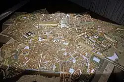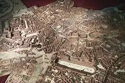 The first modern models of Rome appeared at the end of the 18th century, made of cork or plaster,[38][39] intended for wealthy tourists or collectors like Louis-François-Sébastien Fauvel and Louis-François Cassas.[40] Notably, they included a 3-meter-long Colosseum and a Pantheon displayed at the Johannisburg Castle.[41] A partial relief model of Rome was made between 1850 and 1853 for military purposes following the siege of the city. This model realistically depicted ancient monuments as part of the backdrop for events,[42] though they were not its primary focus.