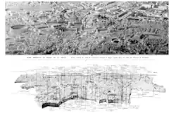 Bigot chose to work on a disappeared structure in a densely built area.[18] His third-year submission[19] in 1903 was a reconstruction of the Circus Maximus,[20] which at the time was covered by a gasworks plant. In 1905, he submitted a board titled Research on the Boundaries of the Grand Circus, attempting a plausible reconstruction of a monument that was "almost entirely disappeared." This reconstruction was still considered plausible even at the end of the 20th century despite certain "risky" elements.[21] To support his hypotheses, Bigot conducted archaeological excavations funded by the Académie des Inscriptions et Belles-Lettres,[22] publishing the results and drawing analogies with other structures, such as the Circus of Maxentius.[22] He also produced detailed reports to bolster his funding requests[3] for this costly project.[22] He secured a grant of 5,000 francs from the Académie in 1908,[23] along with private and public funding, including 25,000 francs from the French government in 1909 in exchange for a promise to donate the model to the Sorbonne.[24]