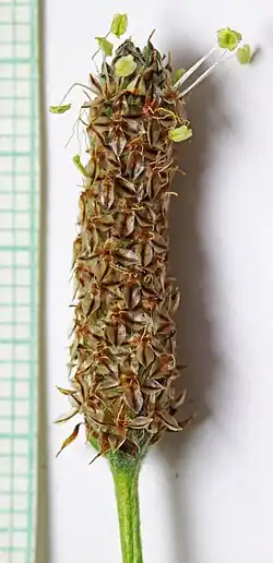 Plantago tweedyi is a perennial herb to 20 cm (7.9 in), from a stout taproot. Leaves are basal, lance-shaped, to 13 cm (5.1 in) long, glabrous (without hairs), and somewhat succulent or fleshy. Inflorescences are cylindrical brownish-to-greenish spikes to 10 cm (3.9 in) long, on scapes (stems) 5–20 cm (2.0–7.9 in) long. Flowers are tiny, to 2.5 mm (0.098 in), densely clustered in the spikes. Capsules are 3–4 mm (0.12–0.16 in) long.[5] [4]