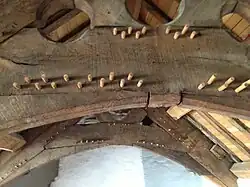 Above these rooms was the great chamber, the main room which formed the ceremonial centre of the house.[64] In the north wing was the brewhouse and the parlour, with two chambers above them, the latter possibly used by Dorothy Wynn as her bedroom.[65] The private bedrooms for the family and guests were each equipped with a fireplace, an important status symbol in the period.[59] The roof attics of the house contained a great deal of space for accommodating the household servants.[54] The attic above the great chamber has a grand timber roof with arch-braced collar trusses, joined using an unusual system called "double pegging", which is only used in the Conwy valley during the late 16th century.[66] It appears that the great chamber's ceiling was originally supposed to be open, looking up to the timbers with the trusses visible, but a mistake in the construction of the walls meant that one side of the chamber no longer fitted smoothly with the timbers, creating an ugly appearance; a plaster ceiling was then added to hide the error.[66]