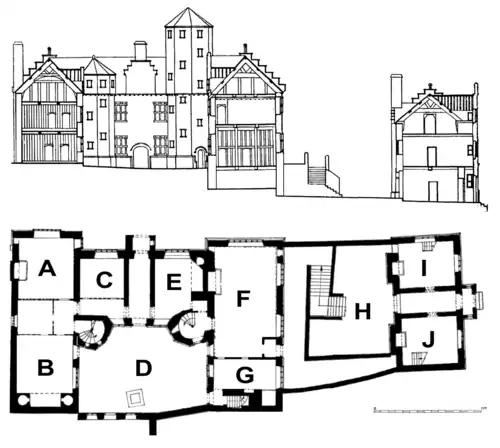 Modern visitors typically enter the house from the High Street to the south, passing through the gatehouse, across the lower courtyard into the hall of the main building. Plas Mawr's gatehouse was only the third such entrance building to be built in North Wales, despite gatehouses being an important part of English Elizabethan architecture, designed to show off the house and provide a suitably dignified entry for visitors.[58] Few houses in towns had the physical space for a gatehouse like Plas Mawr's.[59] Originally, the gatehouse would have contained a suite of rooms for the steward of the house, Richard Wynn.[60]
