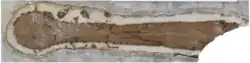 Plataleorhynchus is based on holotype NHMUK R.11957 (earlier BMNH R.11957),[1] an incomplete anterior upper jaw with teeth found in a chalkstone quarry near Langton Matravers.[2] The fossil is present on a plate; its underside is visible. It was previously part of the Corfe Castle Museum and then the Dorset County Museum during the 1950s before the Natural History Museum purchased the specimen in 1958.[2] It was undescribed prior to 1995.