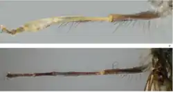 - The first fore tarsomere broadens evenly from base to apex, measuring 1.5 to 2 times as long as it is broad. The second fore tarsomere is variable in shape, rectangular, and can be up to 1.5 times as wide as it is long, approximately one-quarter the length of the first tarsomere. The remaining fore tarsomeres are unmodified. The fore femur features a ventral row of 4-6 stiff black setae (thick hairs) on its basal half. Additionally, there is a row of weak black posterior setae on the basal third of the fore tibia, while the other two-thirds of the tibia have setae that are three times as long. The mid femur has a ventral row of 5-7 weak black or white setae on its basal half. On the basal third of the mid tibia, there is a posteroventral row of 5-6 weak black setae on the apical half, which are approximately three times as long as the tibial diameter. [1] [3] [4]
